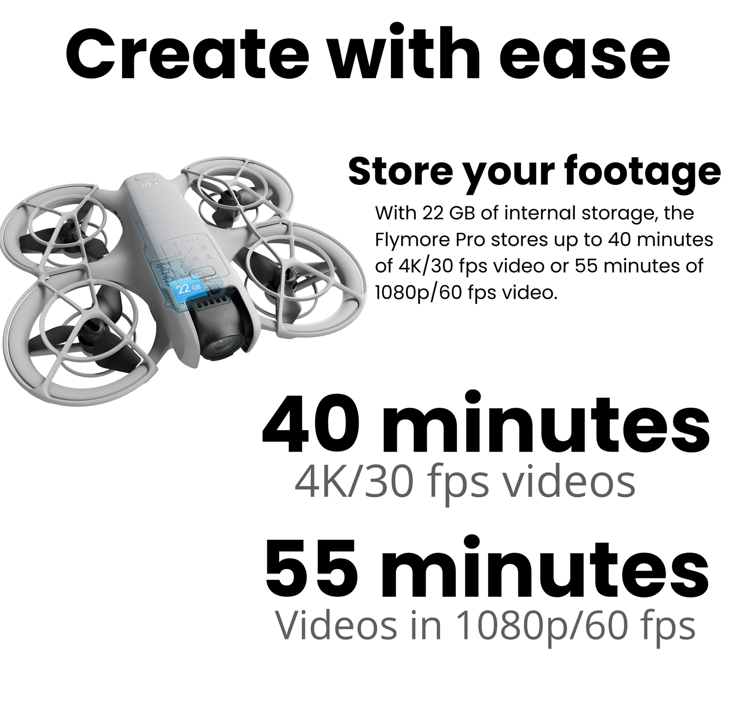 O Flymore Pro conta com um sensor de imagens de 1/2” para capturar fotos de 12MP. Para gravação, os vídeos são estáveis e em resolução de até 4K/30 fps.